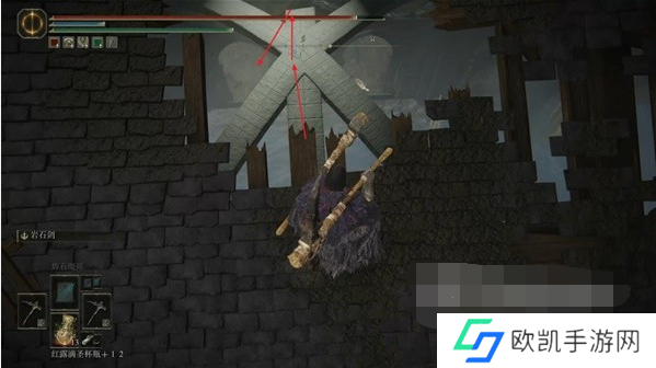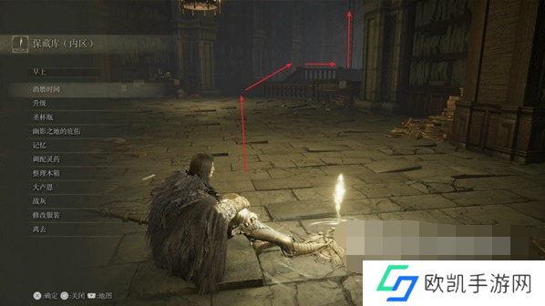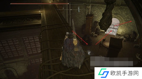 8、爬到第三层的位置,先走到前方小门的位置,此时往右后方看,通过此处的出口走到外侧楼梯,沿着楼梯爬到上层激活赐福【保藏库(阁楼)】。