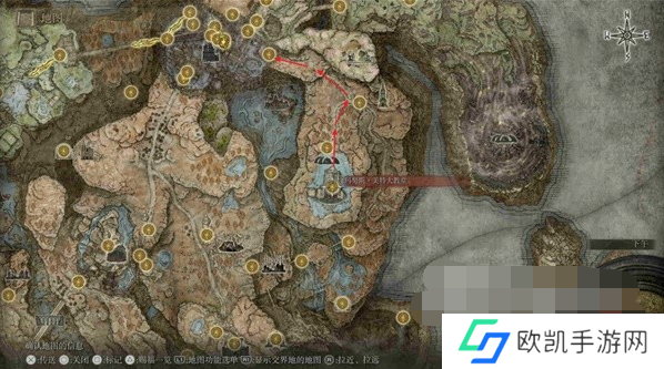 15、赐福【隐匿之地】出发按照下图路线依次激活【隐匿之地(桥边)】与【指岩山丘】两个赐福,继续往右下的【狄欧指头遗迹】走。