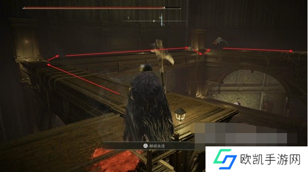 10、来到横梁上层沿着下图路线继续在横梁上走,注意右侧第二个拐角位置需要跳一下,如果掉下去还得重新按照刚才的路线跑一遍。