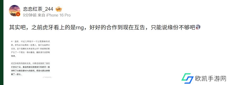 对于专访的内容,恋恋红茶感慨到,此前虎牙在投资iG之前是投资RNG,两个战队从好好合作到现在对簿公堂,只能说缘份不够吧!