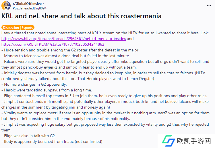 以上消息源于KRL与neL的直播,由HLTV和reddit论坛网友整理汇总,并非由爆料人书面形式爆料。真实性上有待商榷,只算是提供了转会期的一些更多细节,仅供读者分析。