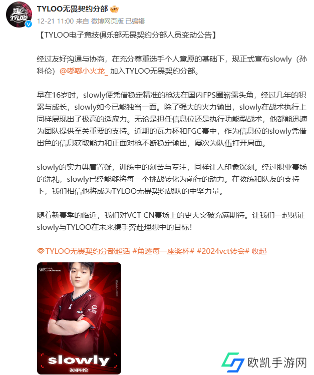 经过友好沟通与协商,在充分尊重选手个人意愿的基础下,现正式宣布slowly(孙科伦)@嘟嘟小火龙_ 加入TYLOO无畏契约分部。