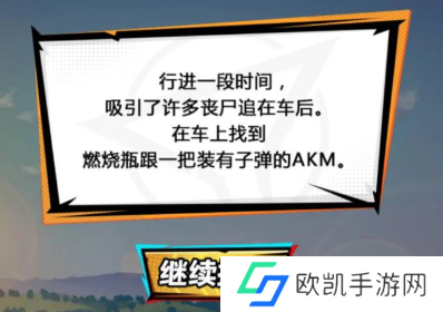 成功逃走,结果又遇上一群丧尸,这里给出两个选择,一个是【启动汽车】;另一个是【徒步前进】。玩家选择徒步前进会得到武器、子弹跟燃烧瓶,选择启动汽车会得到燃烧瓶与AKM,这两个选择差别不大。