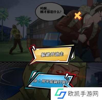 重新开始游戏选择【尝试联系队友】,得到一把砍刀,应该是不同的选择会得到不同的装备。得到平底锅就继续剧情,下一个选择就是:【躲避并逃走】+【冲!用平底锅打丧尸】,如果玩家选择用平底锅打丧尸,你挂定了,因为平底锅是无法完全抵挡丧尸进攻的,很容易被攻击到。最正确的选择是【躲避并逃走】,打不过就要逃,在游戏里也是如此。