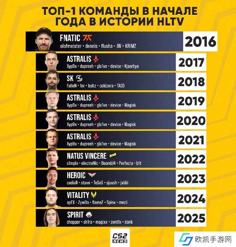 近日,有俄罗斯媒体统计了自2016年以来,以HLTV世界第一身份开启新的一年征程的队伍们。其中,Astralis在年初以头名身份开局的次数最多。而今年伊始,Spirit战队赶超