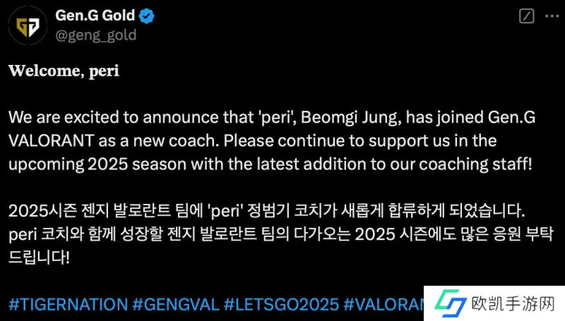 GEN战队在社交平台发文:我们很高兴地宣布,peri加入Gen.G无畏契约分部担任教练。在即将到来的2025赛季,请继续支持我们。