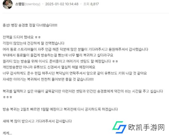 虽然很想早点回来,但是希望能给各种各样的配置和普通人宋坰浩一些休息时间哈哈。