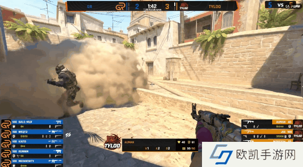 GR先做进攻方,手枪局直接五人提速A区,结果被TYLOO轻松接住。次回合GR选择纯e。