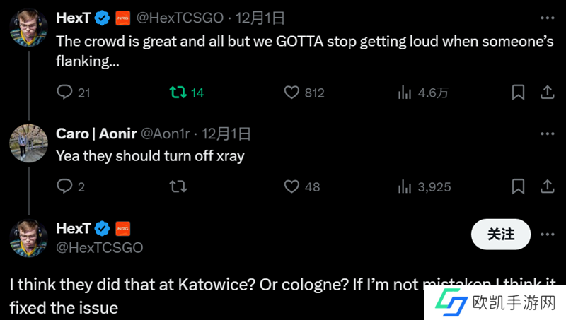 随后在评论区中有CSer建议主办方可以在适当时候关闭X光,而HexT也回复道:“我认为主办方在卡托维兹就这么做的?要么是科隆?如果我没搞错的话,这么做解决了这个问题。”