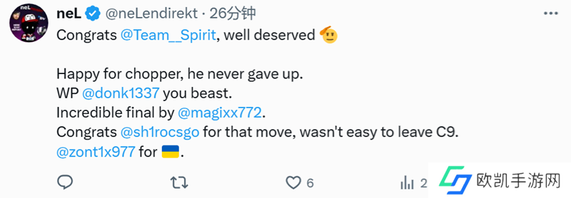 Robin Rönnquist | flusha:祝贺Spirit,他们实至名归。另外很开心看到donk能再度有那样的发挥。Top1确认了?