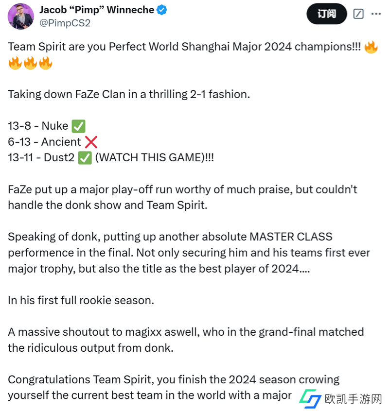 恭喜Spirit,你们在2024赛季结束时以一座Major奖杯为自己加冕,成为目前世界上最好的队伍!