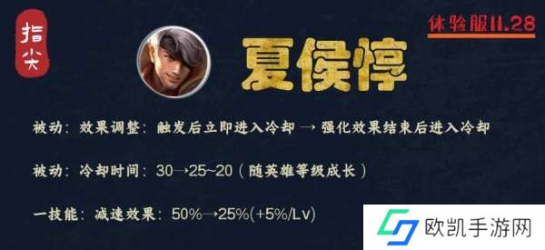 被动效果进行了调整,从触发后直接进入冷却,变成了触发结束后才会进入冷却,而夏侯惇被动存在时间高达八秒,相当于被动CD延后了8秒。