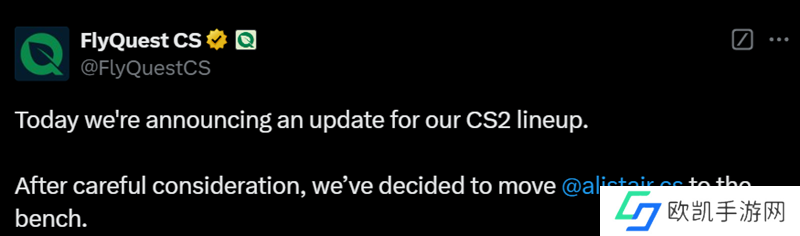 “虽然今天我们决定走不同的方向,但aliStair永远是FlyQuest CS2历史的重要一部分,我们祝愿他在接下来的征程中一切顺利。”