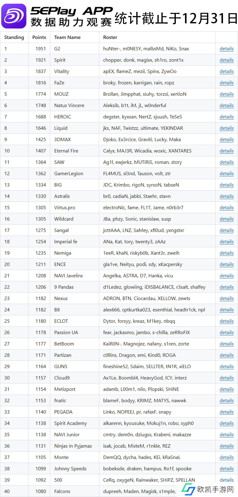 欧洲区前40名如下: