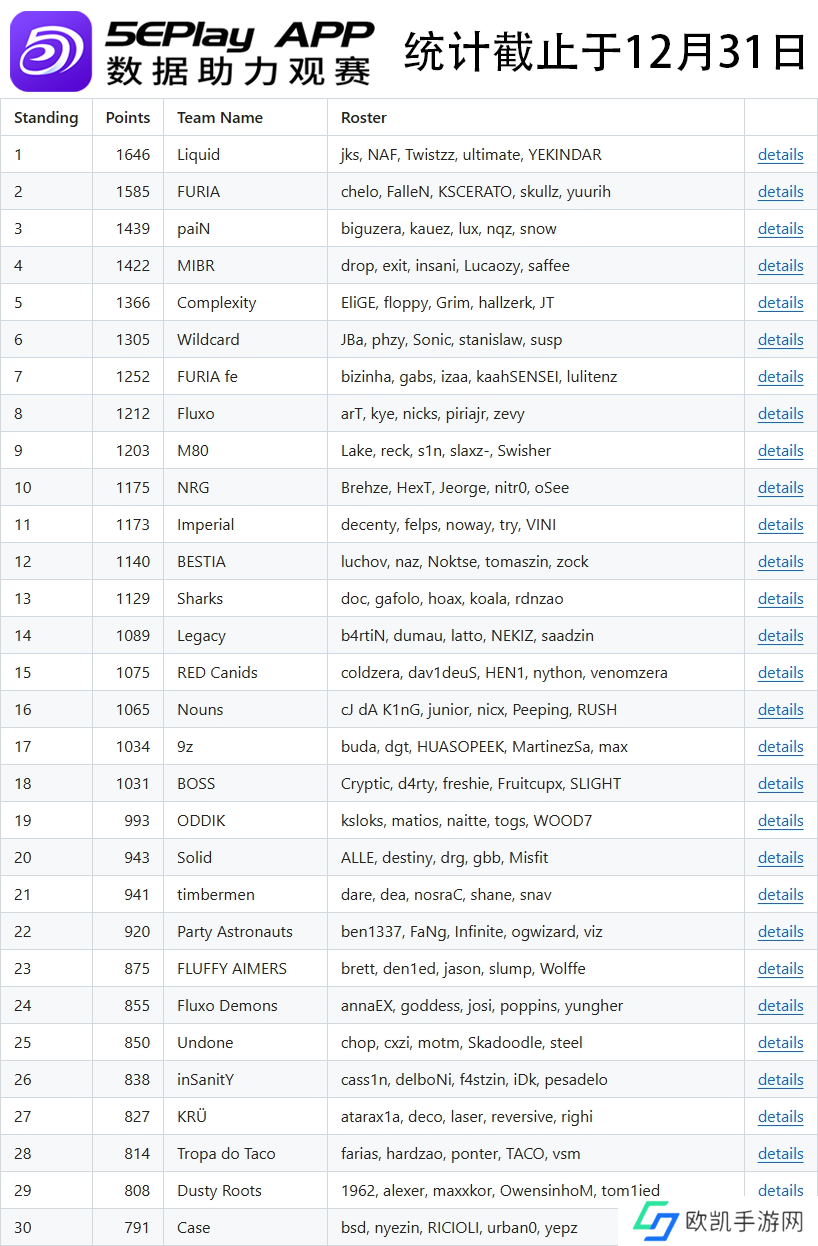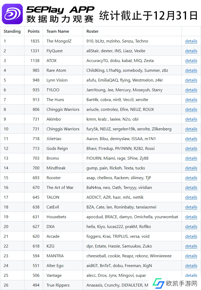 从第12名开始,榜单出现了些许变化。目前排名12的战队由上次的