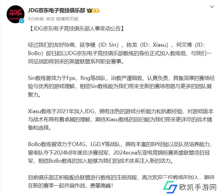 直播吧12月10日讯 官方消息,JDG俱乐部在刚刚公布三则人员变动公告;Sin、Xiasu、BoBo三名教练加入教练组。