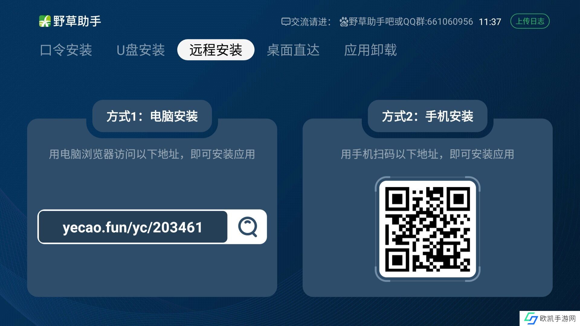 3、远程安装页面中,可以在电脑或手机浏览器中输入页面左边部分的地址,或者使用手机扫一扫右边部分的二维码,可以直接打开相应的远程安装页面,选择手机或电脑中的apk文件 (注意确认结尾是apk的文件,否则找不到这个应用文件),在页面中上传,上传完成后,会自动在电视端下载安装。