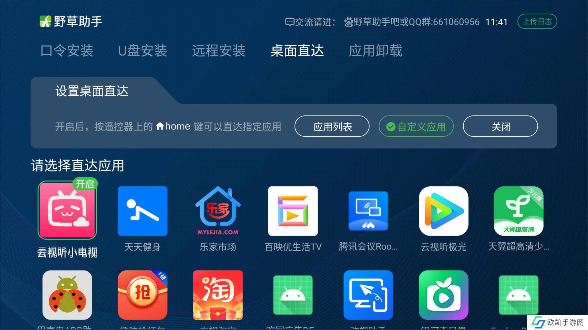 4、桌面直达功能:选择“自定义应用”后,选择一个应用进行“开启”,按home键后即可直接打开刚才选择的应用首页