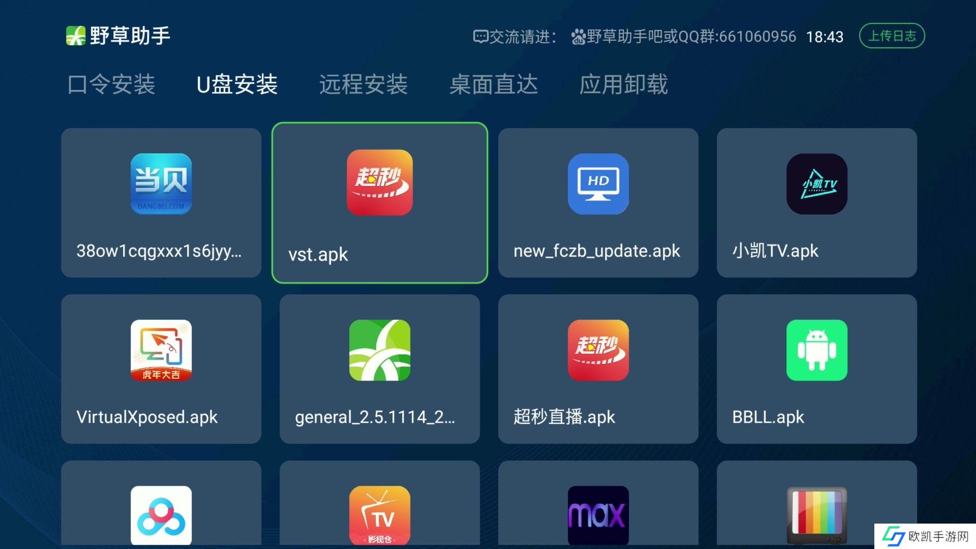 2、插入U盘后,在【U盘安装】页面中,会自动检测U盘中的apk文件,选择点击一个apk文件后,即可安装