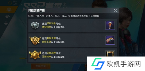 到达铂金段位,并且在铂金及以上段位匹配5场可以获得SS2特训套装。到达王牌段位,并且在王牌及以上段位匹配5场可以获得SS2王牌降落伞。到达无敌战神段位,并且在无敌战神及以上段位匹配5场可以获得SS2战神头像框。赛季结束后根据玩家们的段位会给予对应的宝箱,可以开出服饰币奖励。
