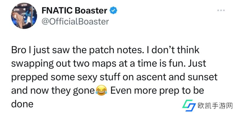Boaster发文评图池轮换,原文大意如下:兄弟,我看到了新版本的消息。我觉得一次性轮换两张图不咋样呀。我刚为亚海悬城和日落之城准备了很多东西,现在它们要轮换下去了。又要有更多的准备要做了。