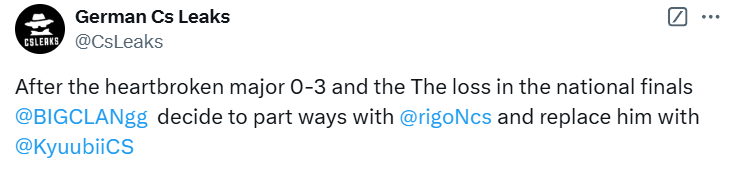 German Cs Leaks:“在经历了心碎的0-3失利后,BIG决定与rigoN分道扬镳,Kyuubii将取代他的位置。”