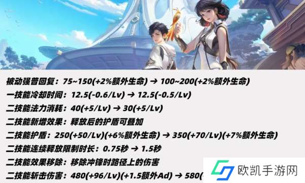强化普攻上调25-50点回血,满级一技能增加0.5秒CD,二技能蓝量消耗减少10点。