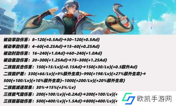 一二三技能上调基础伤害、AD加成改为额外AD加成,一/三技能护盾新增额外生命值加成、
