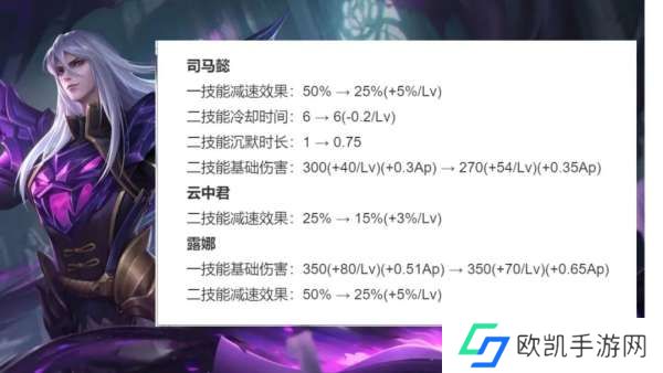 二技能减速从50%调整至25%-50%,一技能伤害下调10点等级成长、上调0.14AP加成。