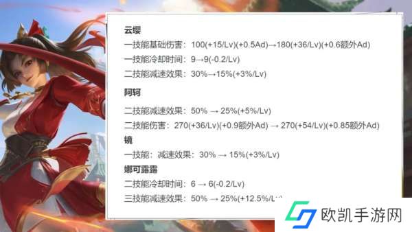 二/三技能减速从50%调整至25%-50%,一技能攻速前期提升10%、满级不变,二技能CD前期不变、满级缩短0.5秒。