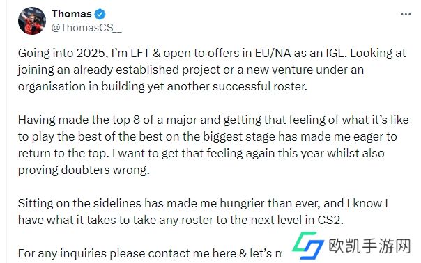 Thomas在个人社交媒体上回顾了自己成功的过往并表示希望在新赛季以指挥的身份重返CS2舞台。
