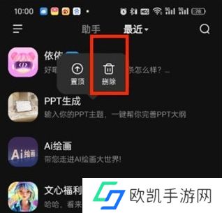 2、然后在最近页面长按要删除的聊天记录点击“删除”。
