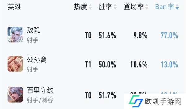 版本最强射手依旧是三位老面孔,敖隐近期巅峰赛51.6%胜率+86.8%BP率,在中高分段就是非BAN必抢的存在。