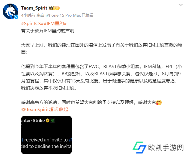 2024年7月底,Spirit俱乐部在ESL公布IEM 里约站的参赛名单后发布声明,解释了他们放弃IEM 里约站的原因。