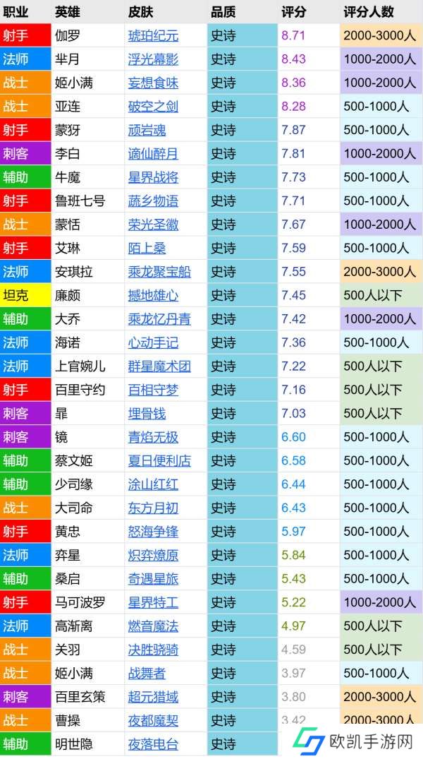 2024年共上架31款史诗皮肤,平均分仅有6.6分。星界战将的分数在其中排名第七,略高于鲁班战令蔬乡物语。