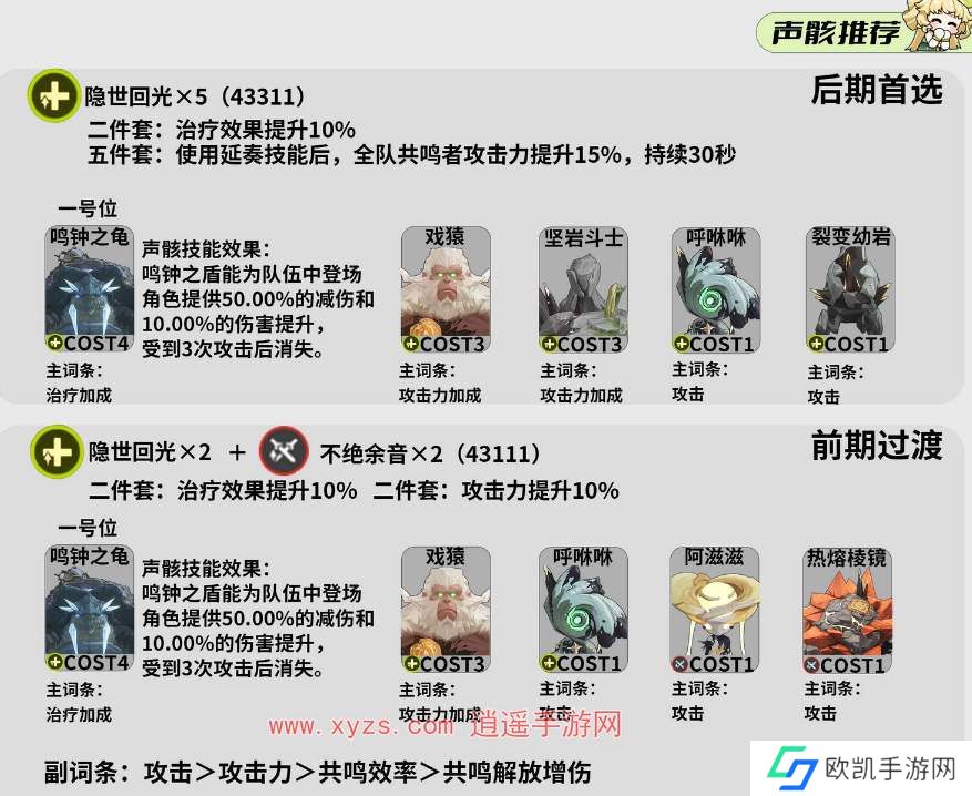 早期强烈推荐2避世回光+2绵绵不绝余音。中后期最好是选择避世回光5套装,为队友提供更好的增益值。