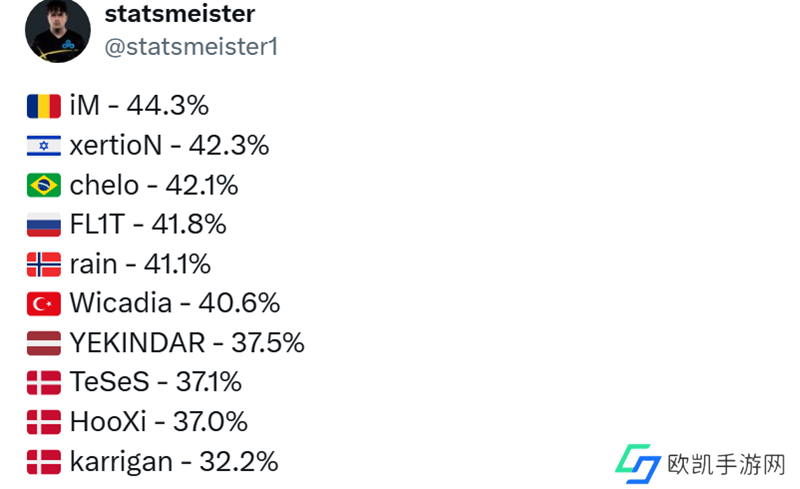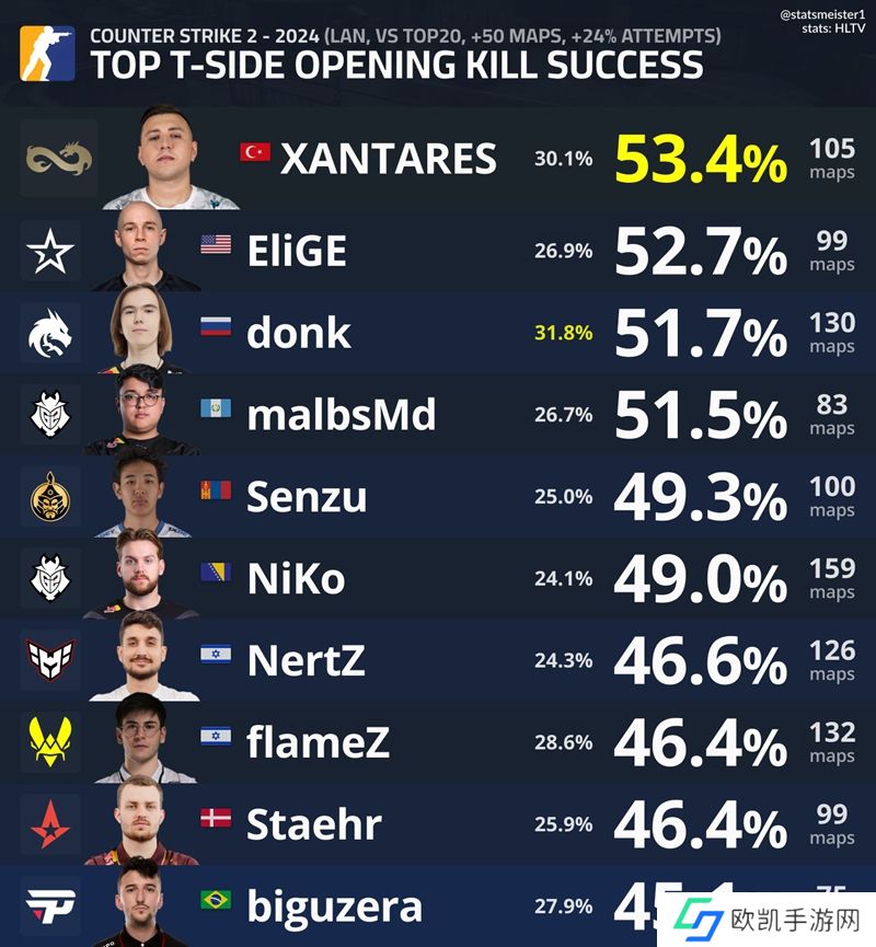 排在第一的是土耳其狠人XANTARES,他在105张地图上首杀尝试率为30.1%,而最终的成功率为53.4%。