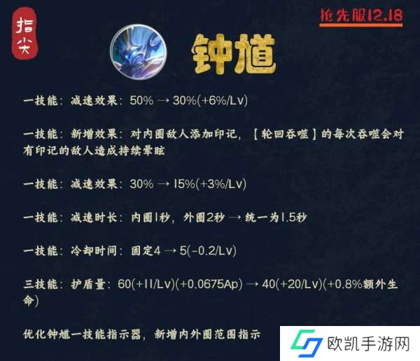 总结:重点是给自己的加速,一技能持续三秒,满级后自己增加20%移速,敌人降低20%移速,一来一回,自己被追击的时候这就相当于对敌人而言有40%减速,而前期如果尽早出凝冰之息,削弱的影响还会更小,另外别忘了,新版本凝冰之息前期减速虽然削弱了,后期减速效果还加强了呢。