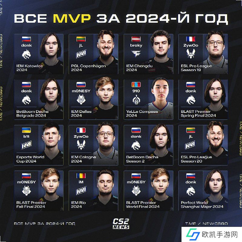 随着今年最后一场比赛上海Major落下帷幕,2024赛季正式收官。下面就让我们一起来回顾一下,今年所有大型赛事中的MVP获得者吧: